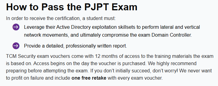 The Practical Junior Penetration Tester (PJPT) certification is a beginner level ethical hacking and penetration testing certification. The exam was $249, which included a free retake as lifetime access to the Practical Ethical Hacking training course. It is meant to simulate a real world internal penetration test on an Active Directory environment with absolutely no flags to capture and no multiple choice questions. As I said, its a practical exam in which you have 2 days to compromise a domain controller and an additional two days to write a professional pentesting report. Here is the official description from the TCM Security website.
