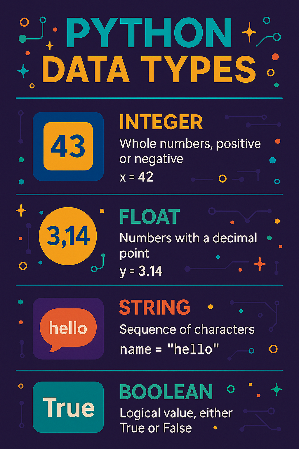 You can think of variables as labeled boxes holding specific value that we can call on later. Variables can be anything you want. In the code below, we have name, age, and height, but we could easily have called them banana, raincloud, and ocean, though that would not be very descriptive. It is good practice to name variables descriptively, both for your sake and for the sake of anyone reading your code. In the above code snippet, notice that we have a few different types of information here. We have the string (str) “Alice”, the integer (int) 25, and the decimal, or float (float), value 5.7. These pieces of data will be handled differently, so it is important to know the most common data types in Python.